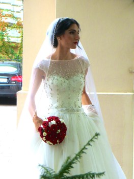 It was the perfect early autumn afternoon in Novi Sad, Serbia. The temperature hovered around 90, but the bride was cool, calm, and collected standing in the shady courtyard by the church, chatting with friends and posing for the camera.