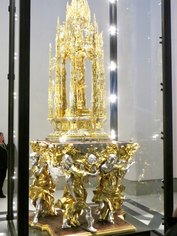 The Treasury is dominated by a luminous, 10-foot-high, 430-pound monstrance, which is a tower designed to hold the Holy Communion wafer (the Host). This 400 pounds of gold-plated silver and 35 pounds of solid gold is paraded through the streets during the Festival of Corpus Christi.