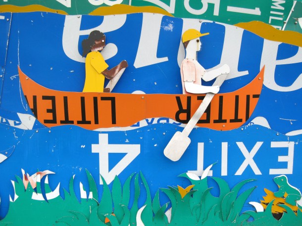 Gilda, I absolutely feel in love with this mural. It’s so creative, and the amount of work to cut up and assemble all these metal signs must have been staggering. It’s roadside Americana at its best. ~James