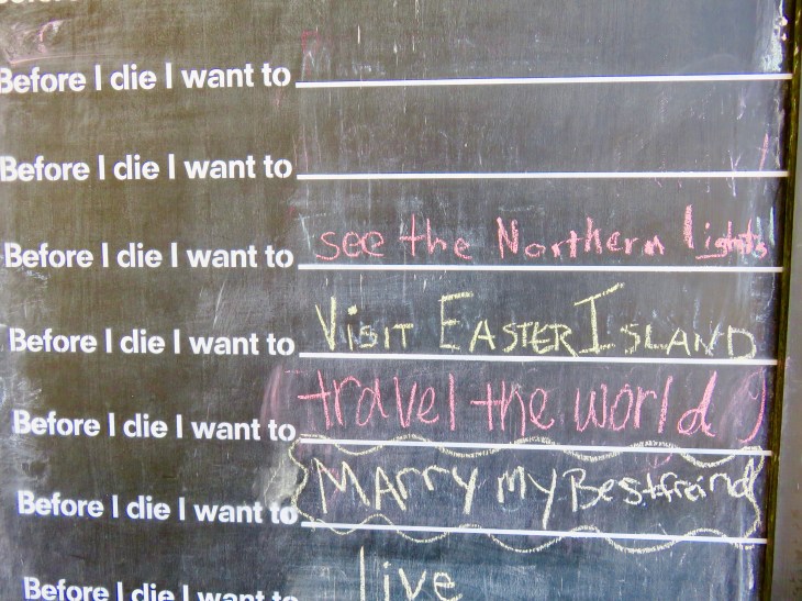 What a fantastic initiative. Much better than the “This or that is on my bucket list” conversations. I wonder whether the town erases the boards frequently, as I can’t imagine there being much room left. Interesting to see the amount of “travel” mentioned. My favorite is “Before I die, I want to live.”