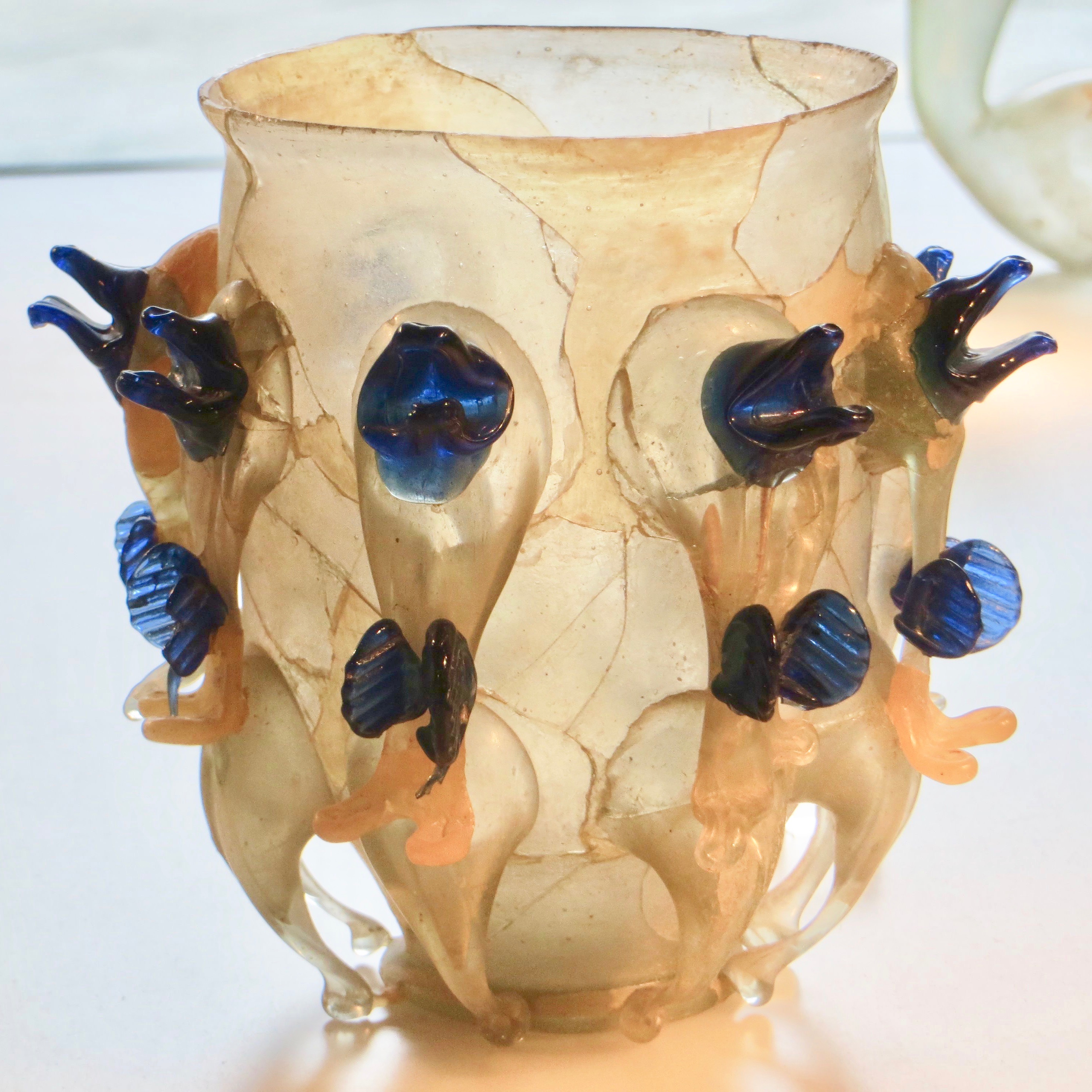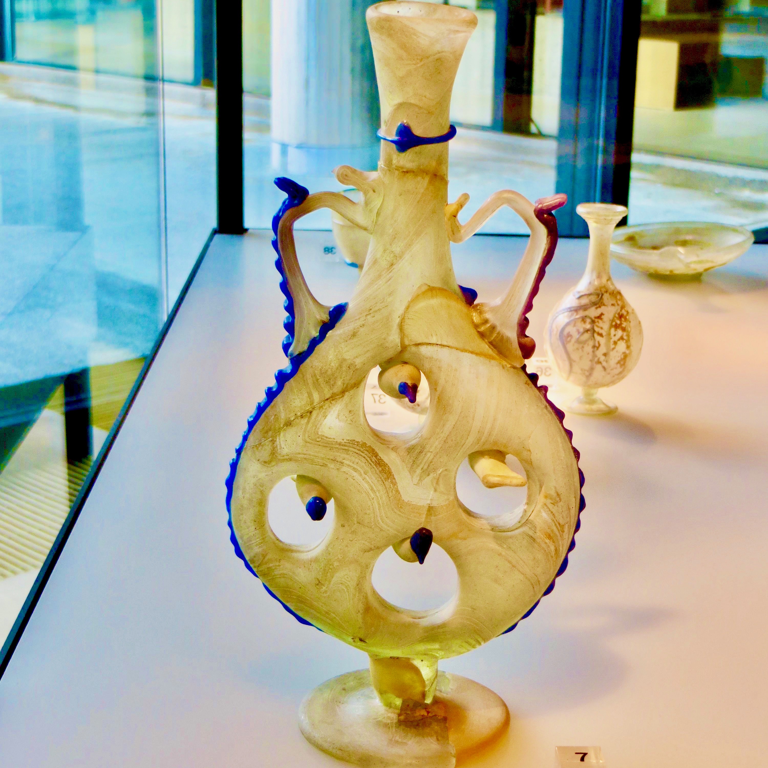 For those living in the U.S., Roman glass can be also be seen a little closer at the Corning Museum of Glass in Corning, New York. But I don’t remember anything as exquisite as those vases with the blue “fringe.”