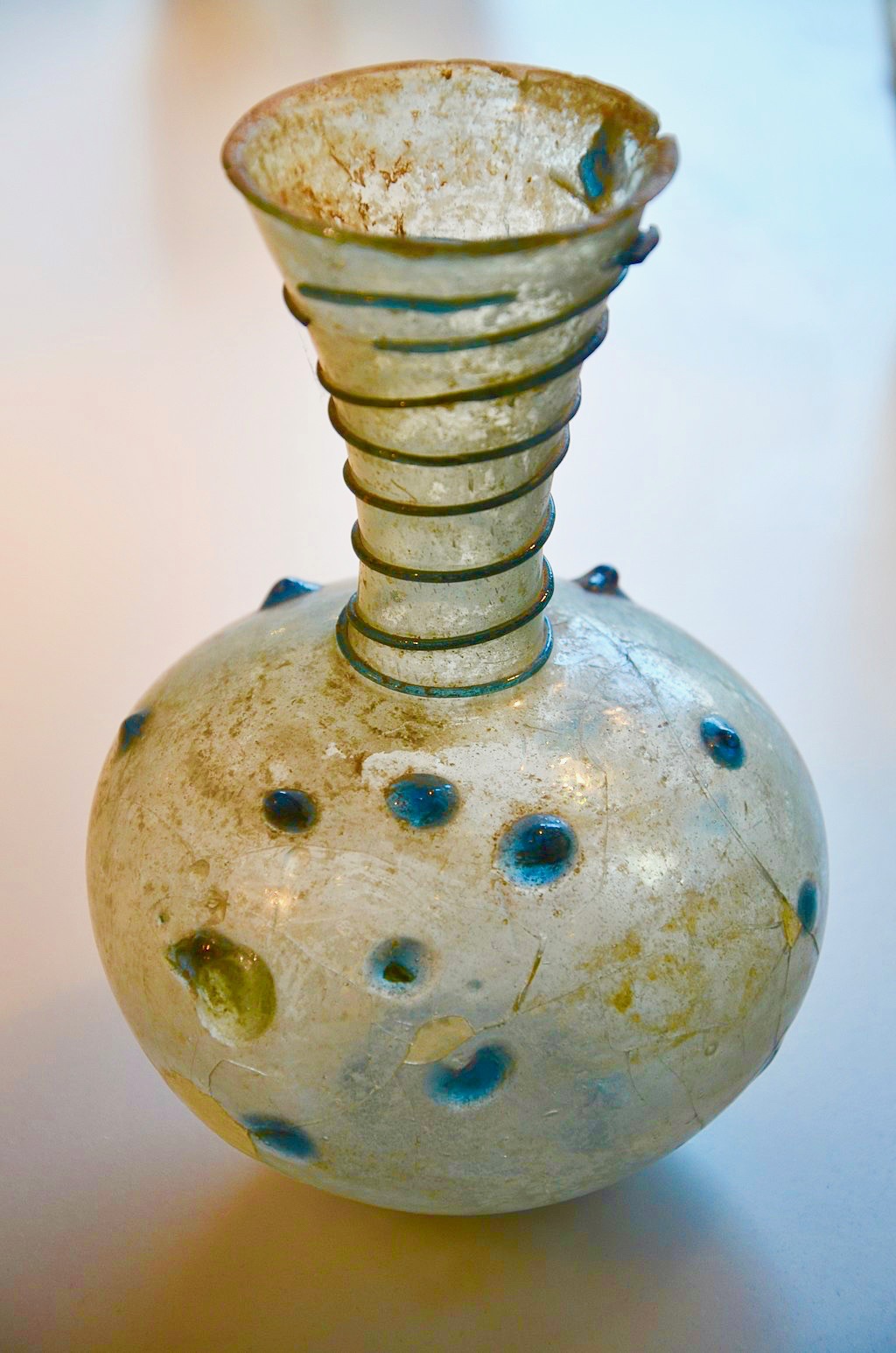 We particularly love the colour/texcture changes that the centuries have wrought in many roman pieces. though that while pot with the coloured blobs could have been made yesterday! (And not a crack or chip).