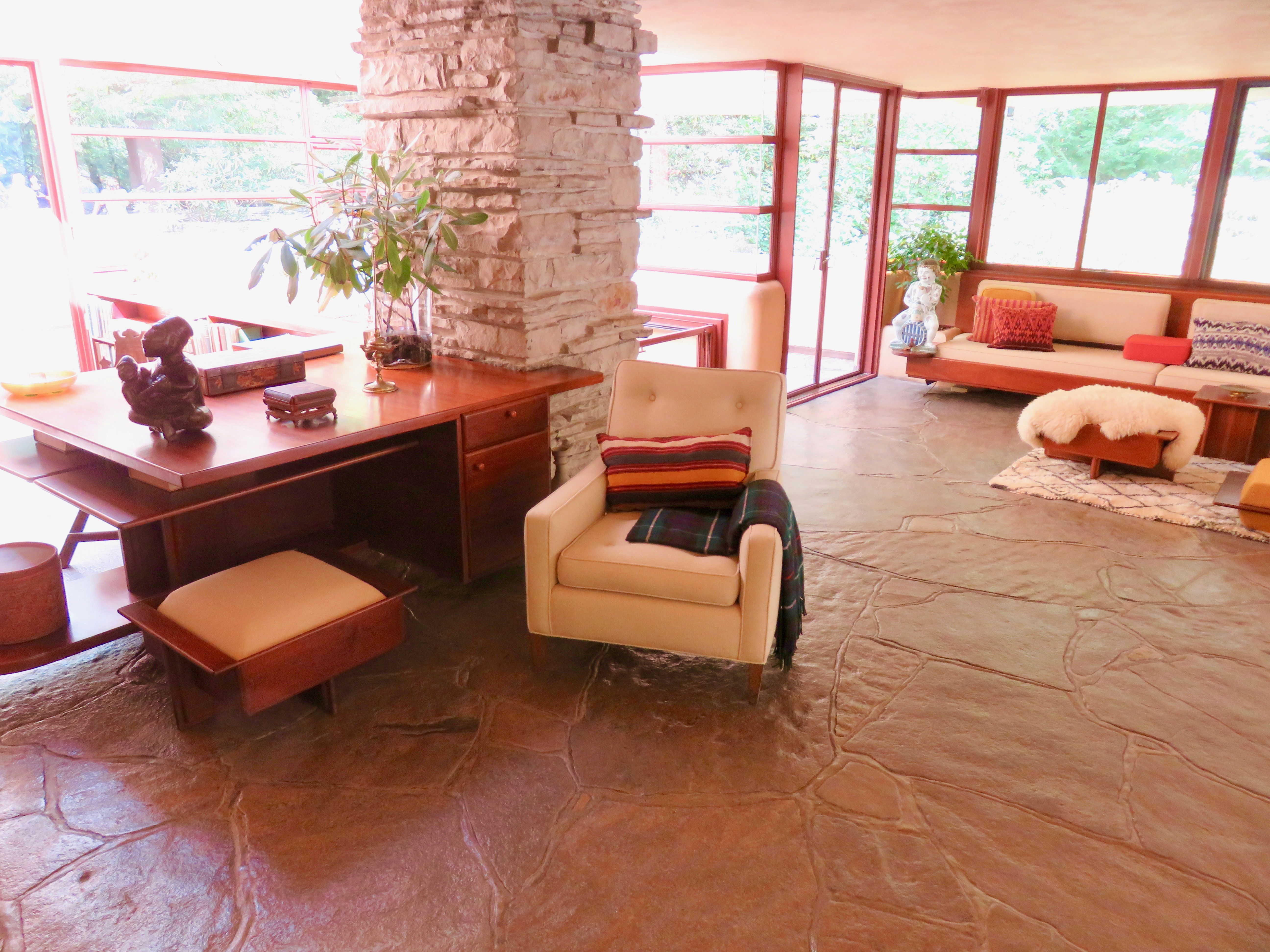 1. Rebecca, we’ve toured a few FLW homes as well, and I have to say that Fallingwater fells the most homey and cozy of all we’ve seen. Luckily, it still had most of the original Wright furnishings as well as many of the things that belonged to the owners, so it felt “lived in.” The setting is fabulous, and I could see myself relaxing just about anywhere on the property. ~James