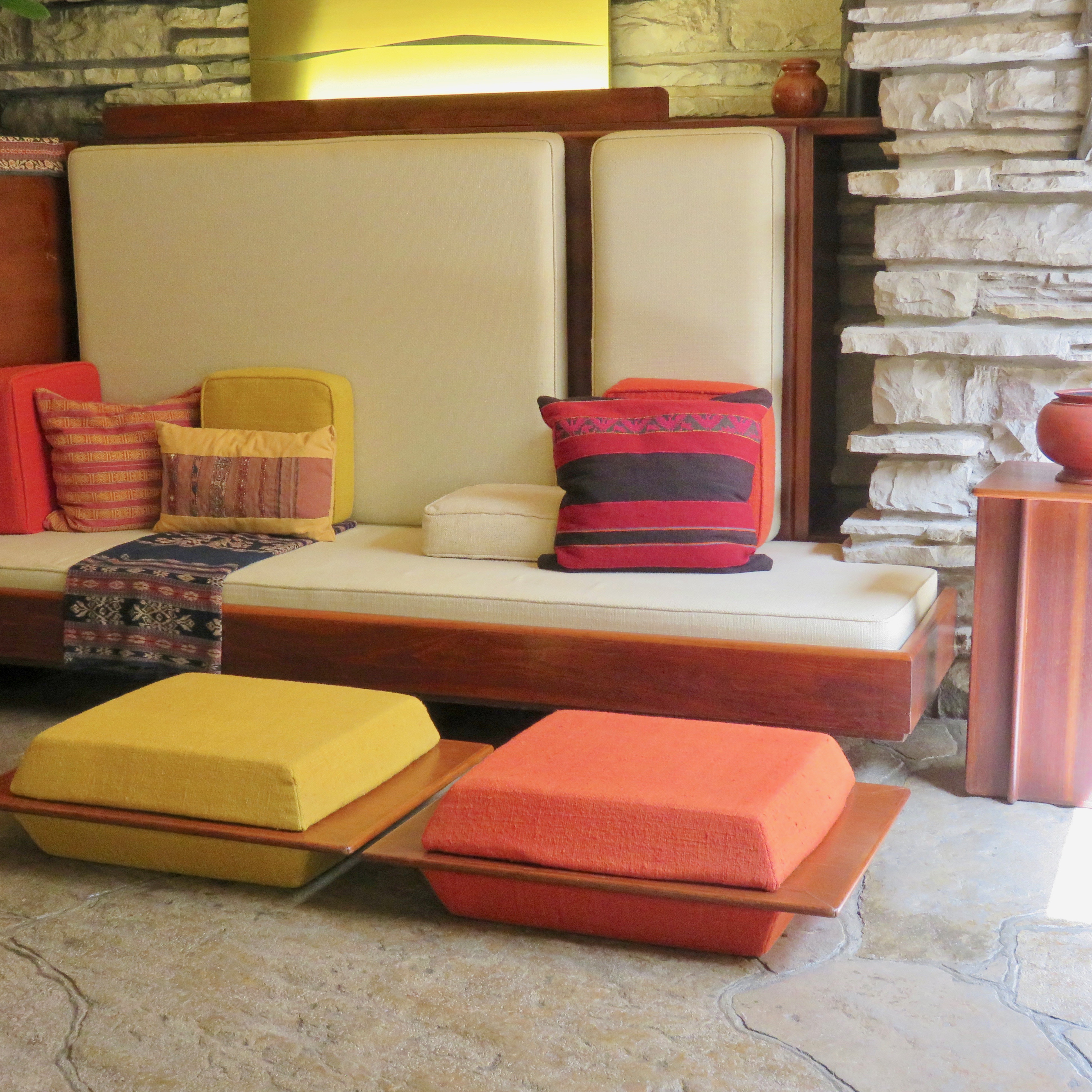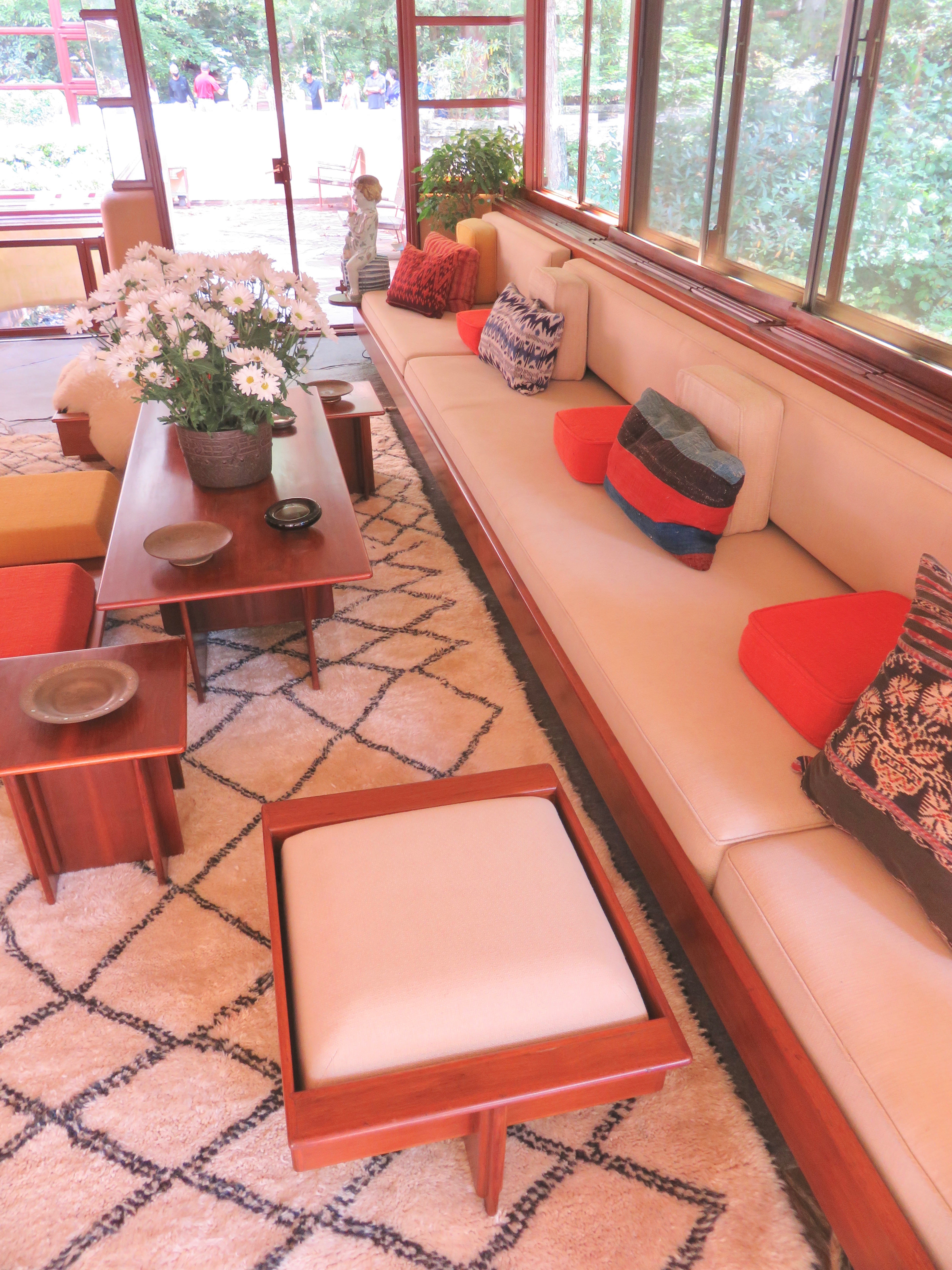 Like all of FLW’s buildings, Fallingwater was designed as a cohesive whole. His design package included custom doors, windows, and light fixtures; bespoke built-in furniture; and natural landscaping that married the house surroundings to the interior of the structure.