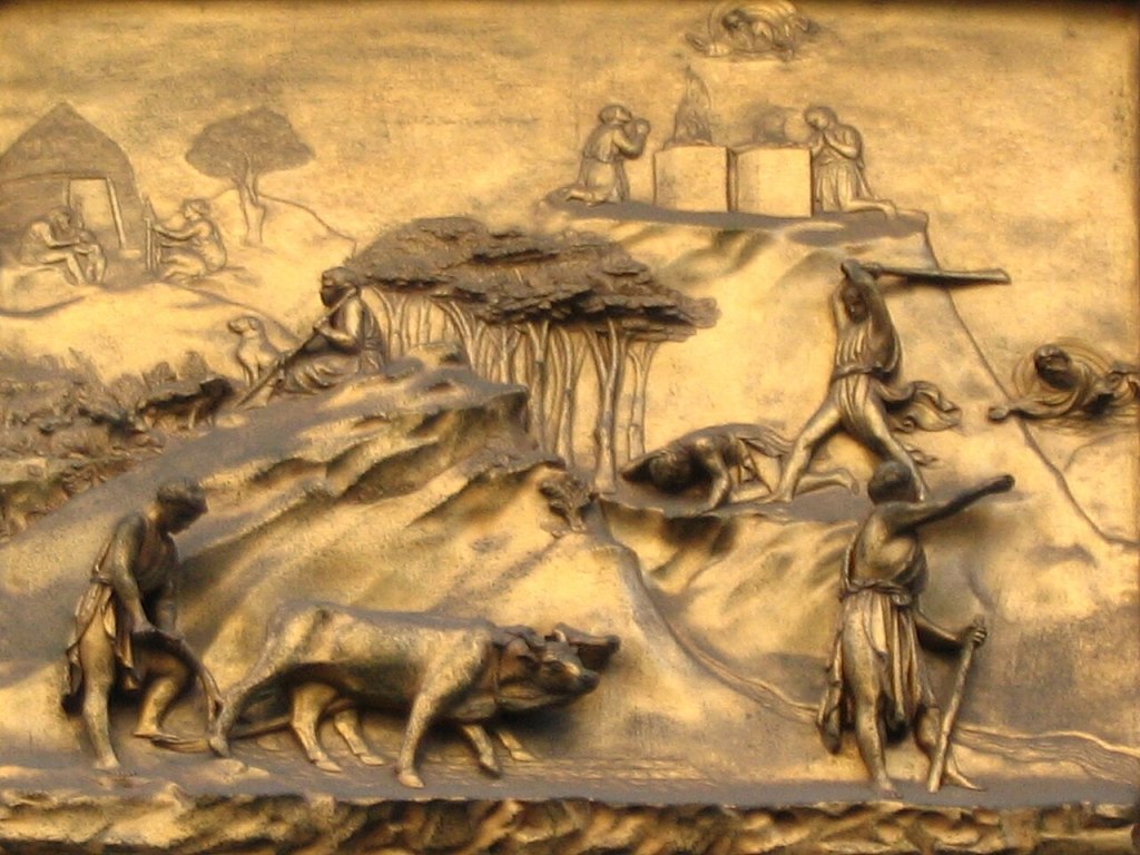 The Baptistery’s prestigious location directly in front of Florence’s Duomo meant that the benefactors, the wealthy and powerful Guild of Cloth Merchants, wanted to make an unmistakable religious statement. A competition was held and Ghiberti’s proposal for a set of doors won the commission. The merchants were swayed by panels depicting a veritable who’s who of Old Testament characters and Biblical stories: Adam and Eve, Cain and Able, Noah, Moses, Abraham, Joseph, and Solomon.